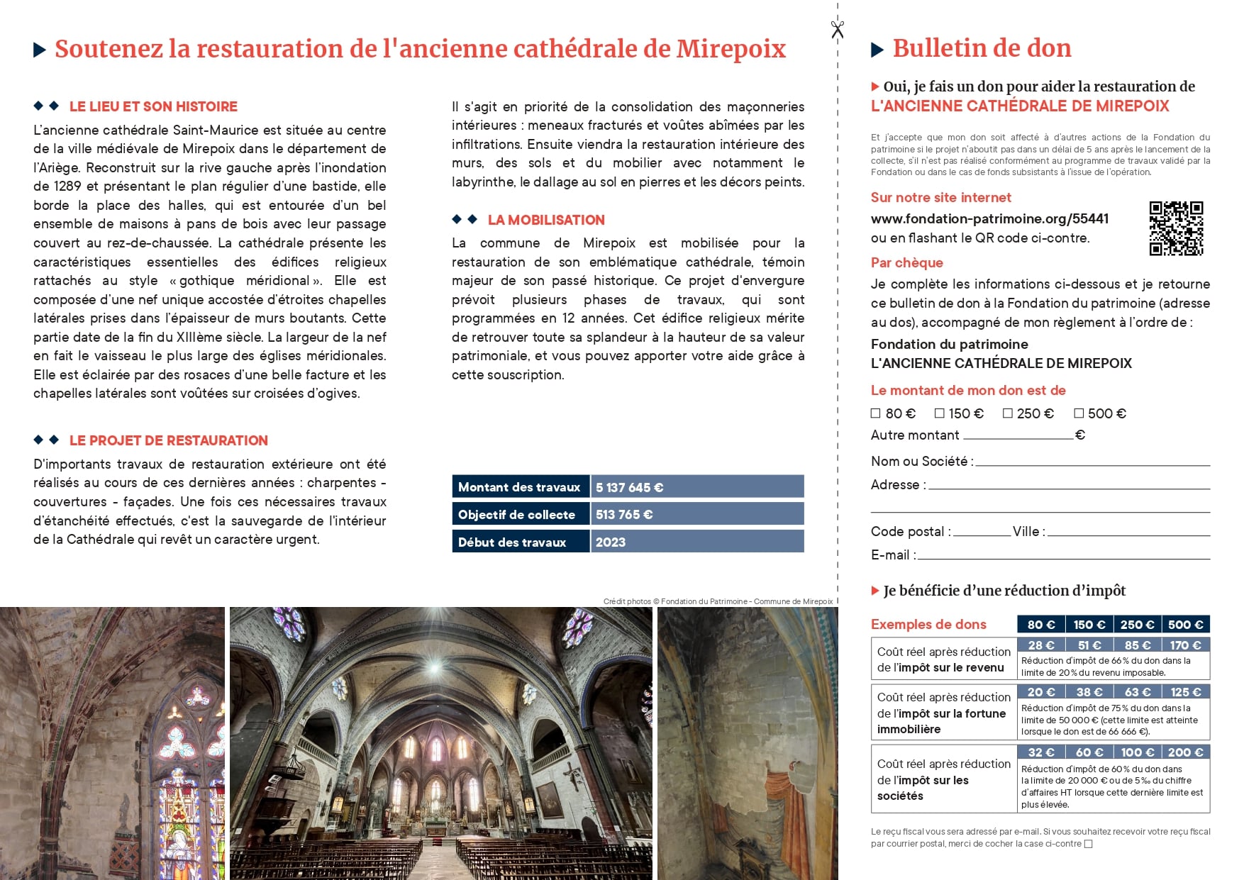 Une campagne de mobilisation a ainsi été lancée afin de récolter des fonds destinés à la restauration de l’ancienne cathédrale de Mirepoix. Coût du chantier : 5 137 645 € HT. L’objectif est de récolter 513 765 €. Les travaux doivent débuter en 2024.