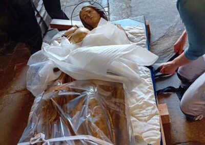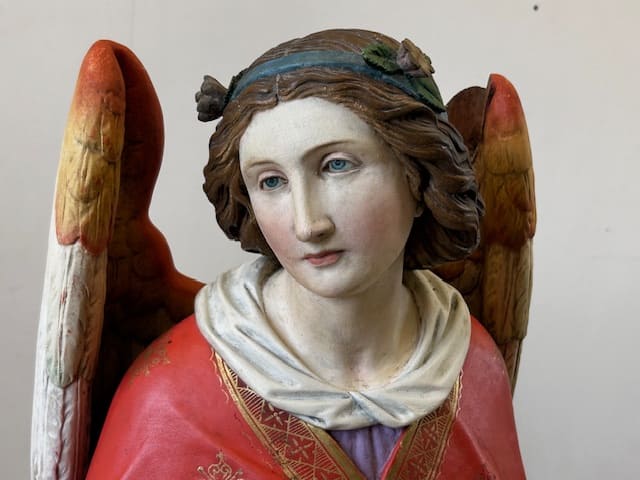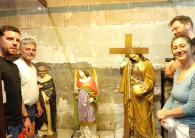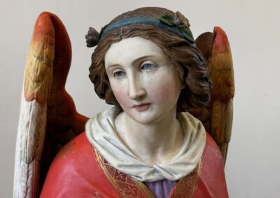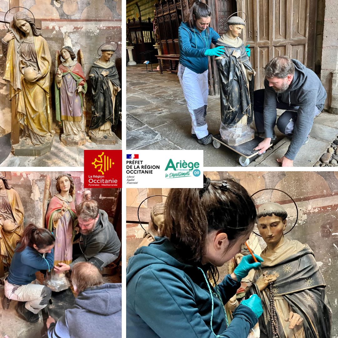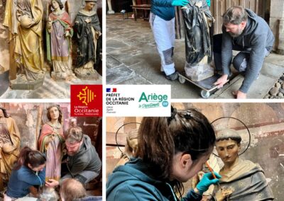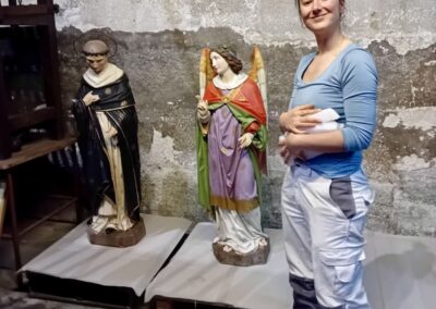 Trois statues protégées au titre des monuments historiques ont été restaurées par l’atelier de Lauren SOUCHARD, restauratrice du patrimoine habilitée “musées de France” et Monuments historiques à Gaillac : une statue d’ange, de St Dominique et de Ste Madeleine datant du 19ème siècle. Les statues ont été victimes des insectes xylophages et ont subi un traitement curatif par anoxie. Cette technique d’assainissement consiste à envelopper la statue dans une poche qui prive d’oxygène les parasites.