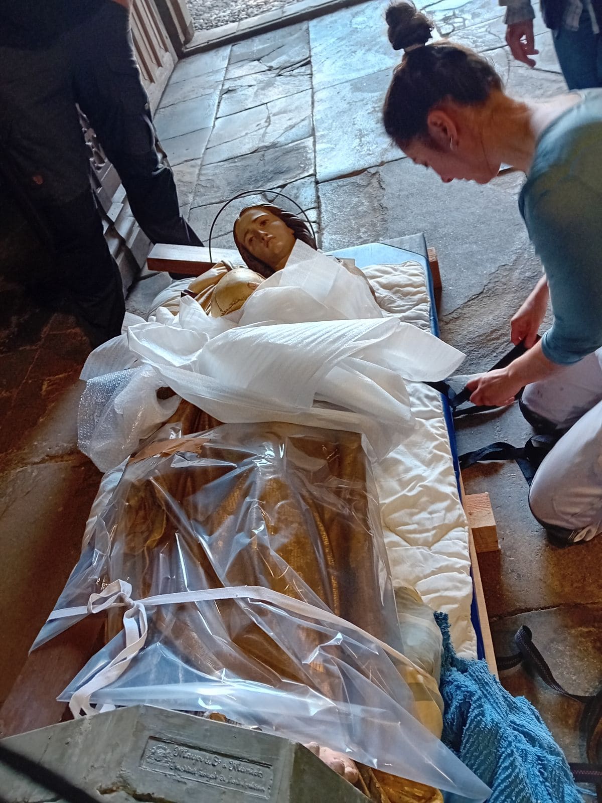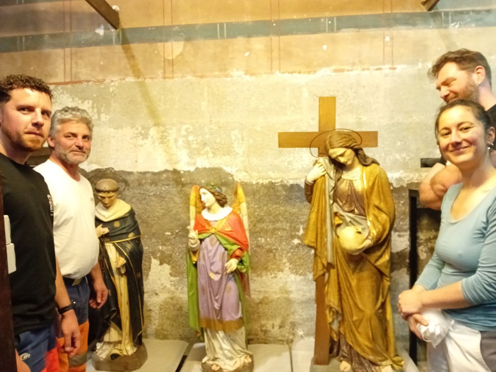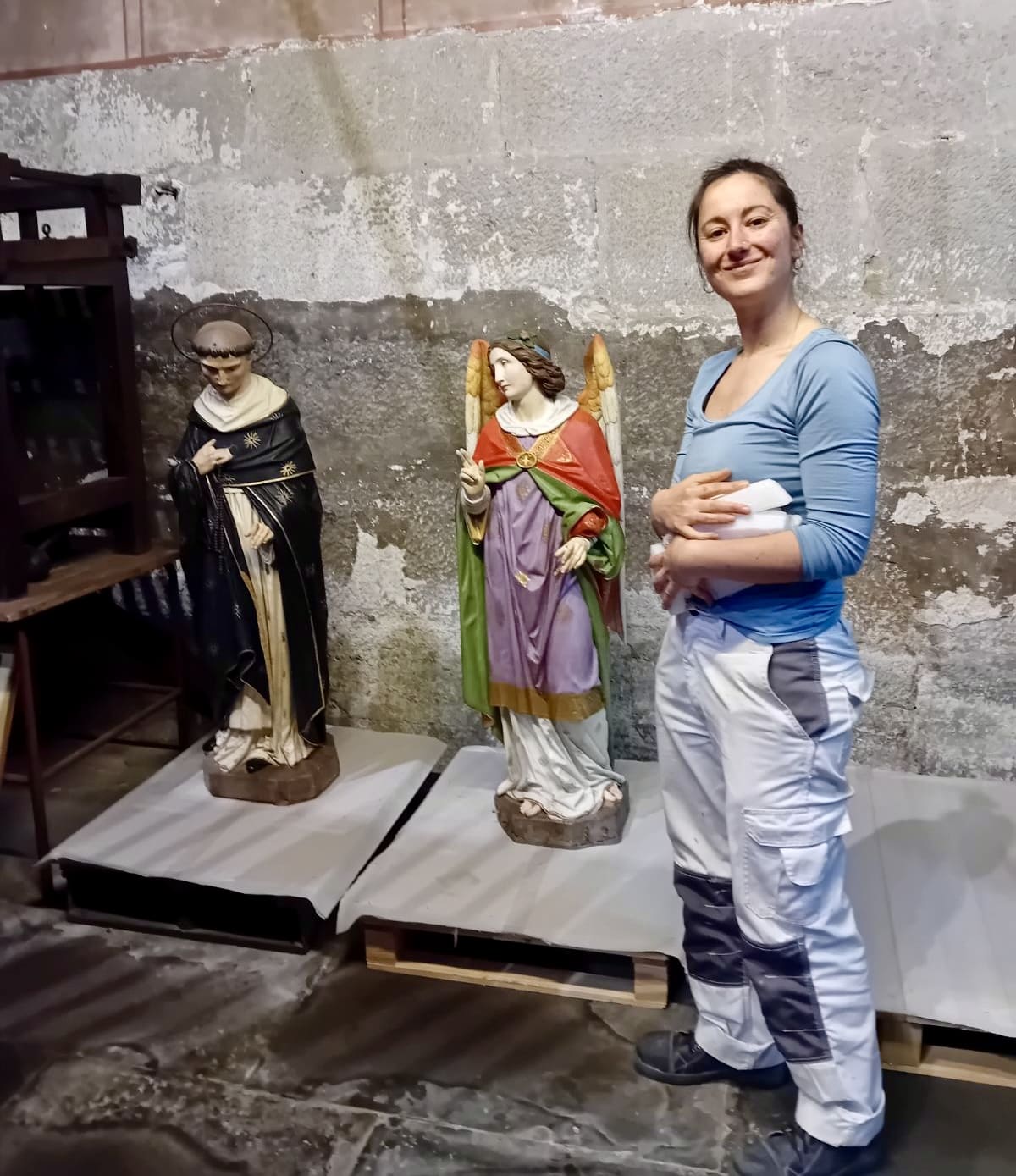 Les statues, de retour à Mirepoix, ont été posées sur des palettes afin d’éviter le contact avec l’humidité du sol, en attendant la confection de socles.