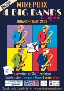 Le LDO BIG BAND en partenariat avec le Festival « Swing à Mirepoix » organise sous la halle de Mirepoix, le dimanche 5 Mai 2024, la 3e rencontre de Jazz regroupant les Big-Bands des écoles de musique de Castelnaudary, Limoux, Muret et Laroque d’Olmes.