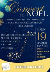 Les élèves, les professeurs de l’école municipale de musique Henri Lazerges vous invitent au Concert de Noël le mardi 19 décembre à 18h à la salle Paul Dardier.